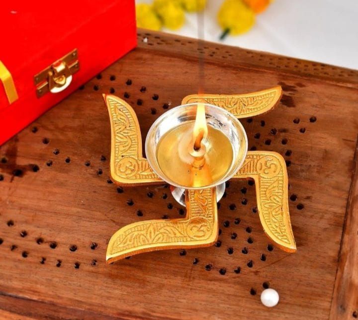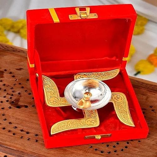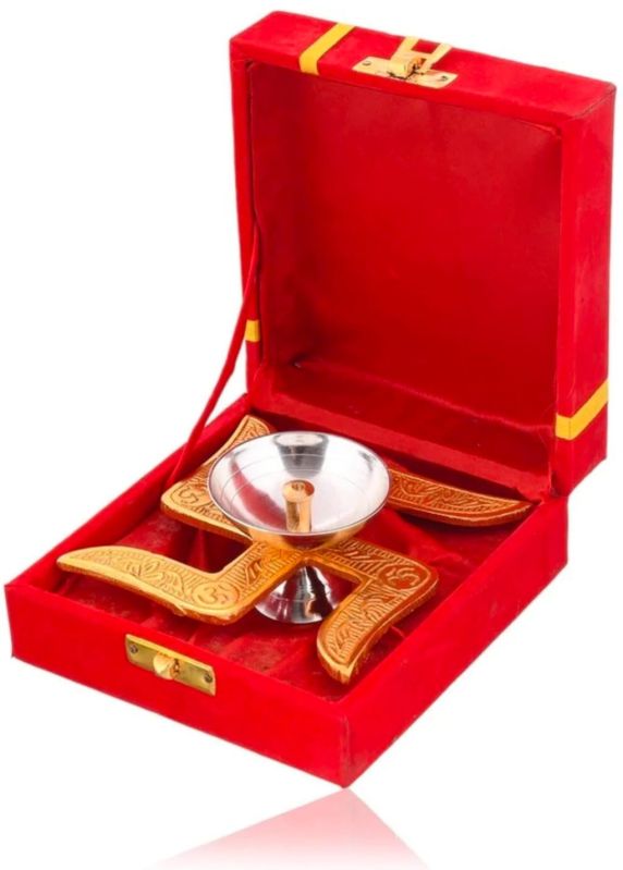 Home › Products › Metal Diya › Brass Swastik Design Diya With Red Velvet Box